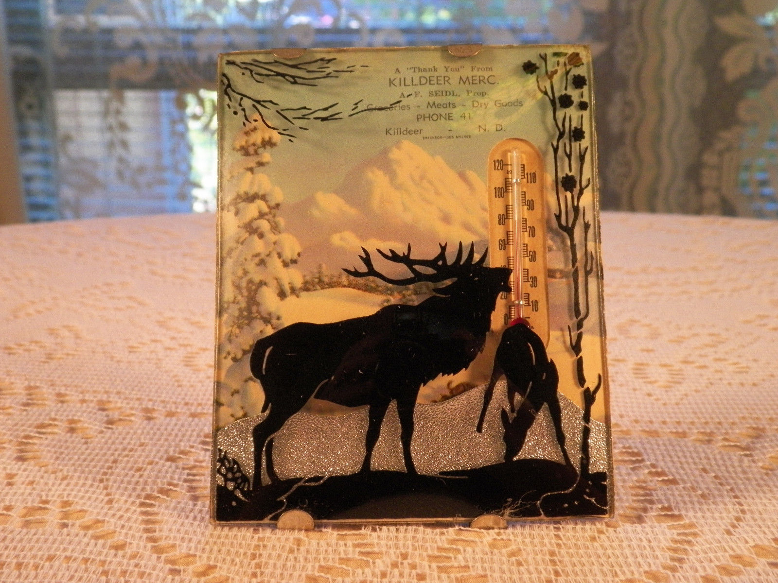 Title (ebay affiliate link): Vintage Reverse Painting Of Elk On Convex Glass With Thermometer And Advertising