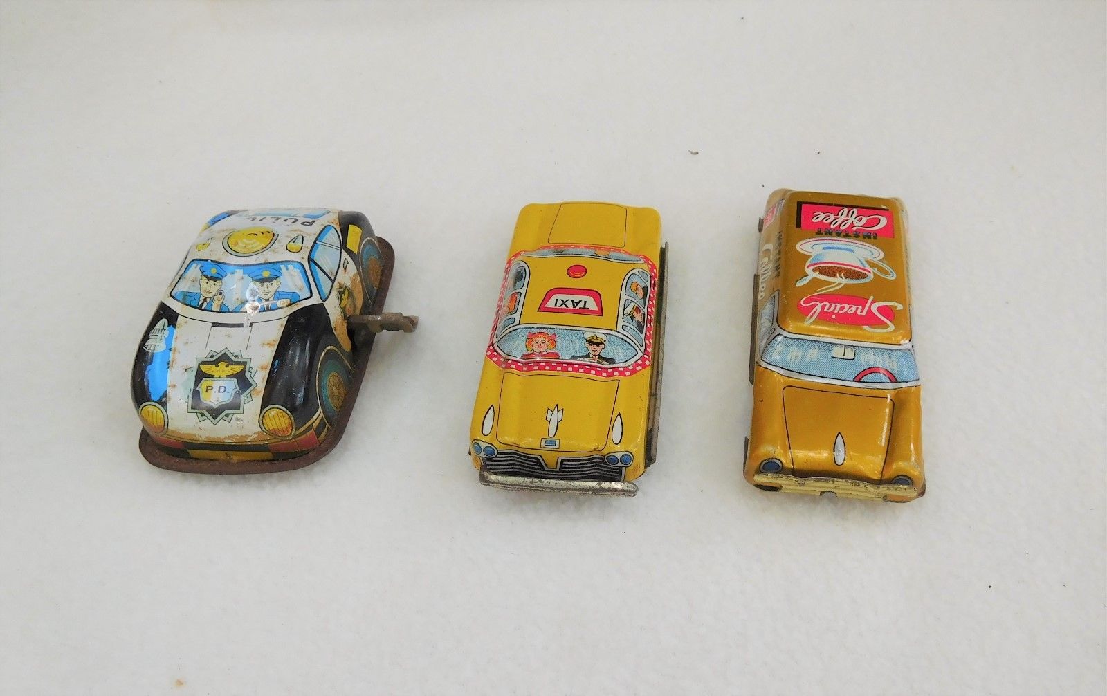 Vintage Lot of Three (3) Tin Litho Cars - Taxi - Police-Coffee