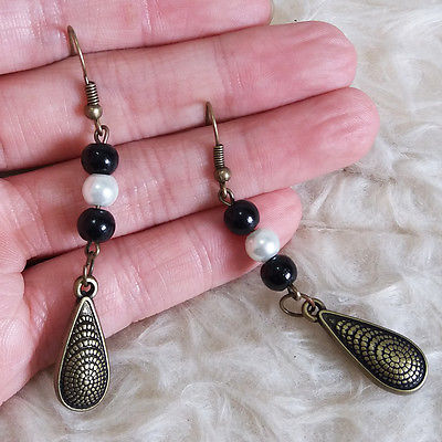 Title (ebay affiliate link): Vintage Womens Antique-Color Plastic Teardrop Black White Beads Dangle Earrings