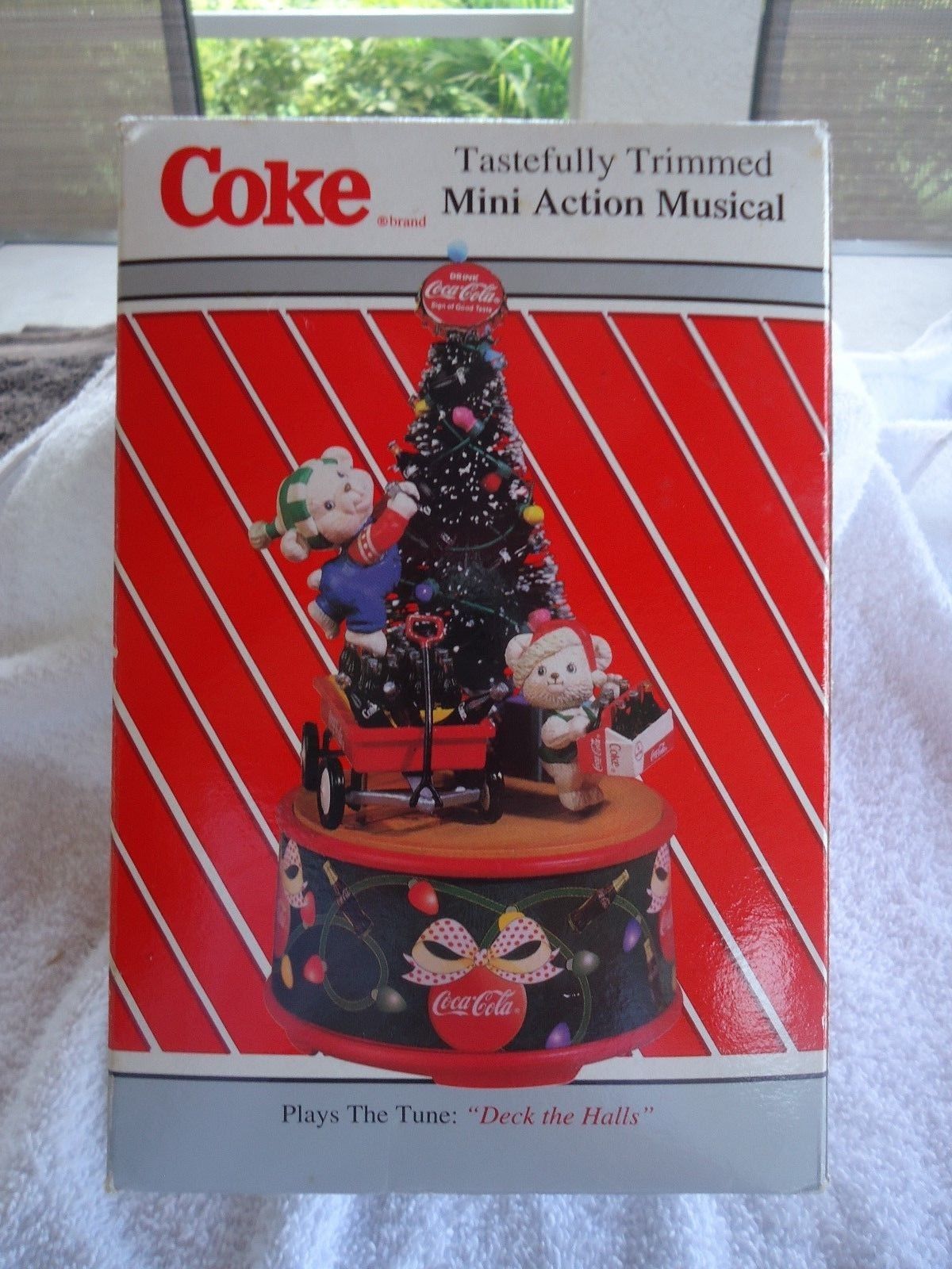 Title (ebay affiliate link): NIB-1996-ENESCO COCA-COLA TASTEFULLY TRIMMED MINI ACTION MUSICAL"DECK THE HALLS"