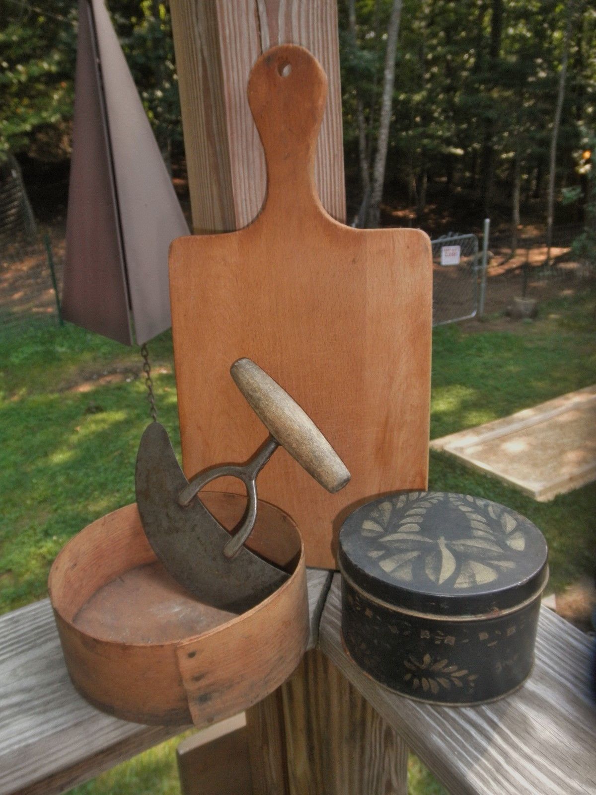 Title (ebay affiliate link): 4 Antique PRIMITIVES For Decor Chopper, Pantry Box, Toleware & Cutting Board