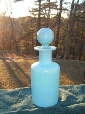 VINTAGE BLUE MILK GLASS VANITY BOTTLE WITH ROUND STOPP