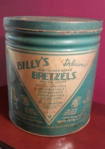 Title (ebay affiliate link): VTG RARE SIZED AQUA BILLYS BRETZELS PRETZEL READING PA 13.5"X12"TIN LITHO CAN