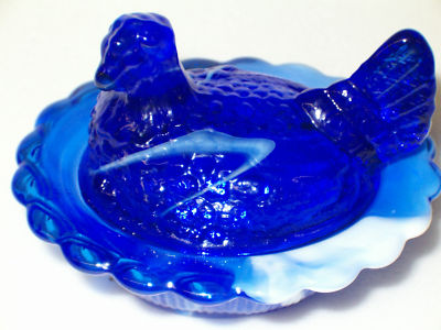 COBALT MILK SLAG GLASS HEN CHICKEN ON NEST BASKET DISH