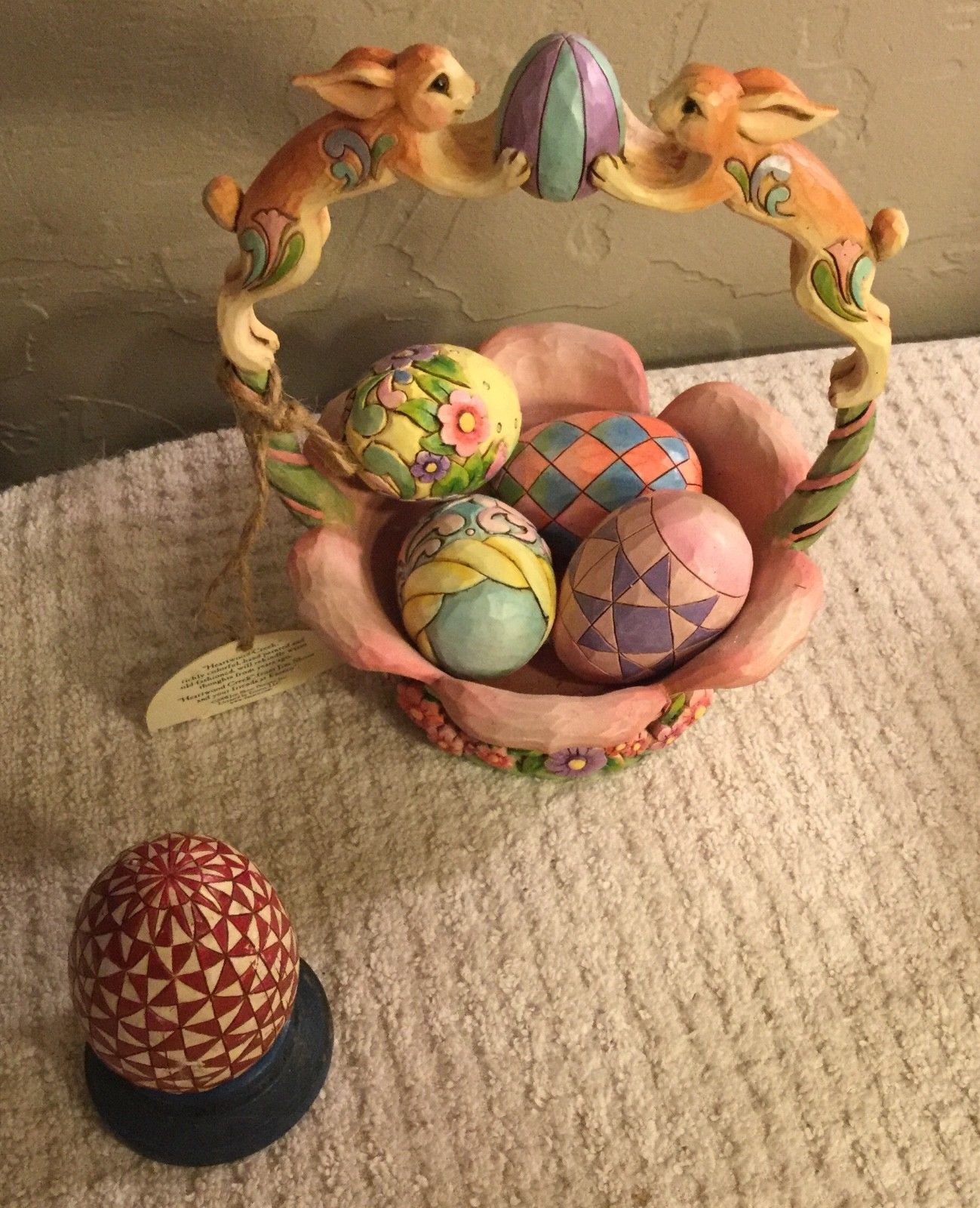 2008 Jim Shore Heartwood Creek Spirit of Easter Basket w/ 4 Eggs & stand