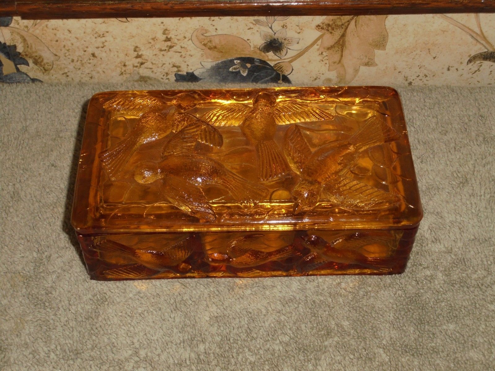 Title (ebay affiliate link): VINTAGE AMBER GLASS BAS RELIEF BIRD LIDDED DIVIDED DRESSER BOX