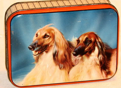 Sharp Afghan Hound Dog Toffee Candy Tin 1930s