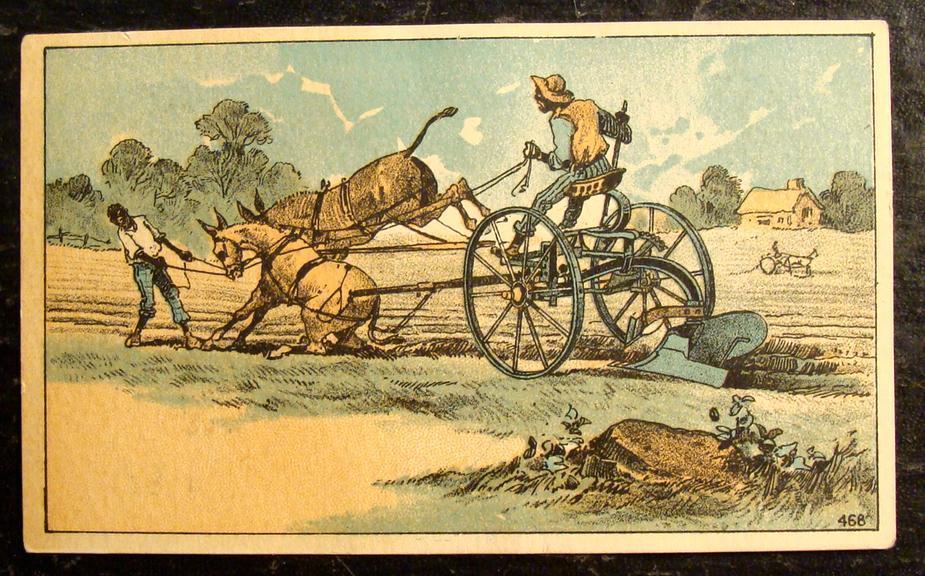 BLACK AMERICANA VICTORIAN TRADE CARD-BLACKS PLOWING MULES, MENS SUITS, BOSTON