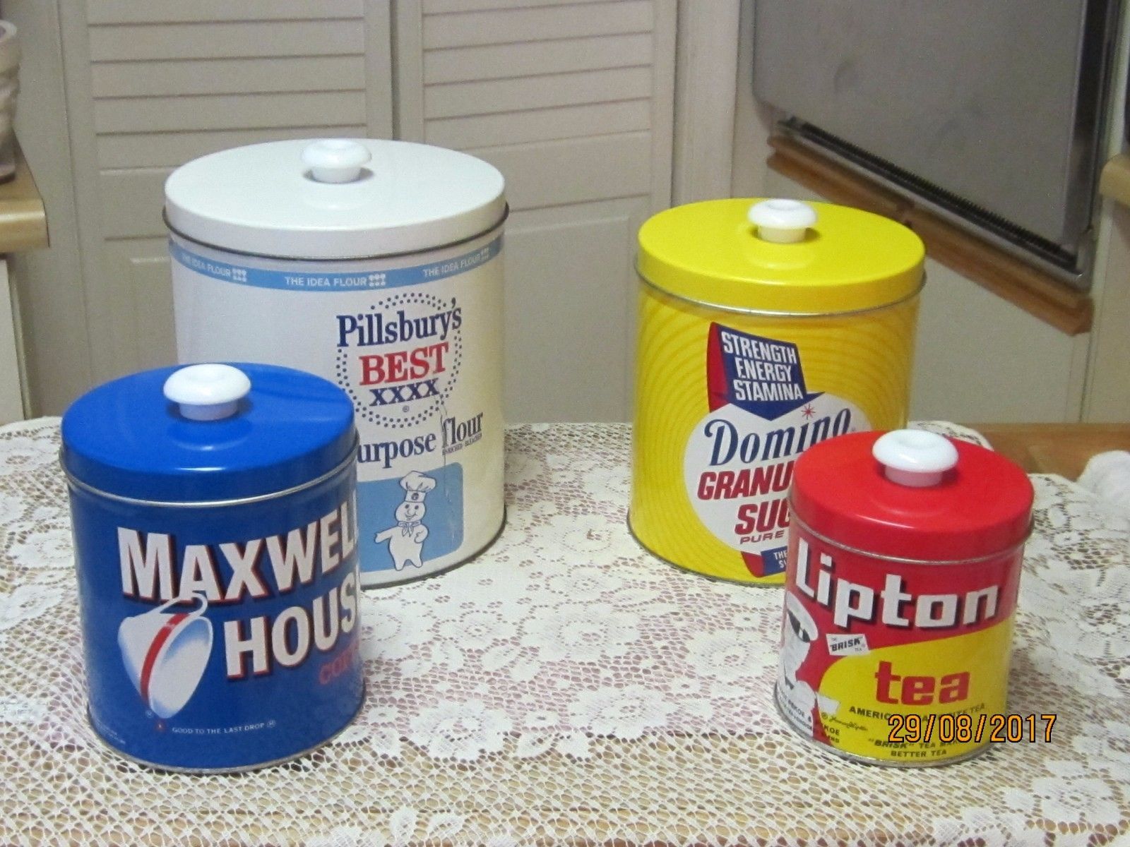 Title (ebay affiliate link): JL Clark Pillsbury Flour Domino Sugar Maxwell Coffee Lipton Tea Tin Canister Set