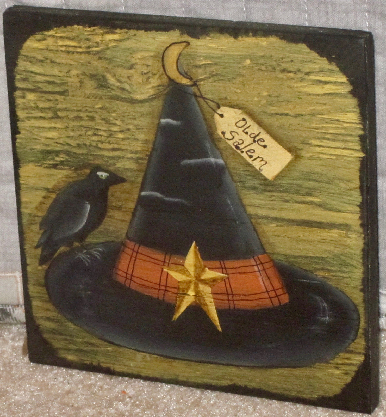 Title (ebay affiliate link): *~*PRIMITIVE*~* HP FOLK ART PRIM WITCH HAT *~* CROW *~* HALLOWEEN *~* BOARD