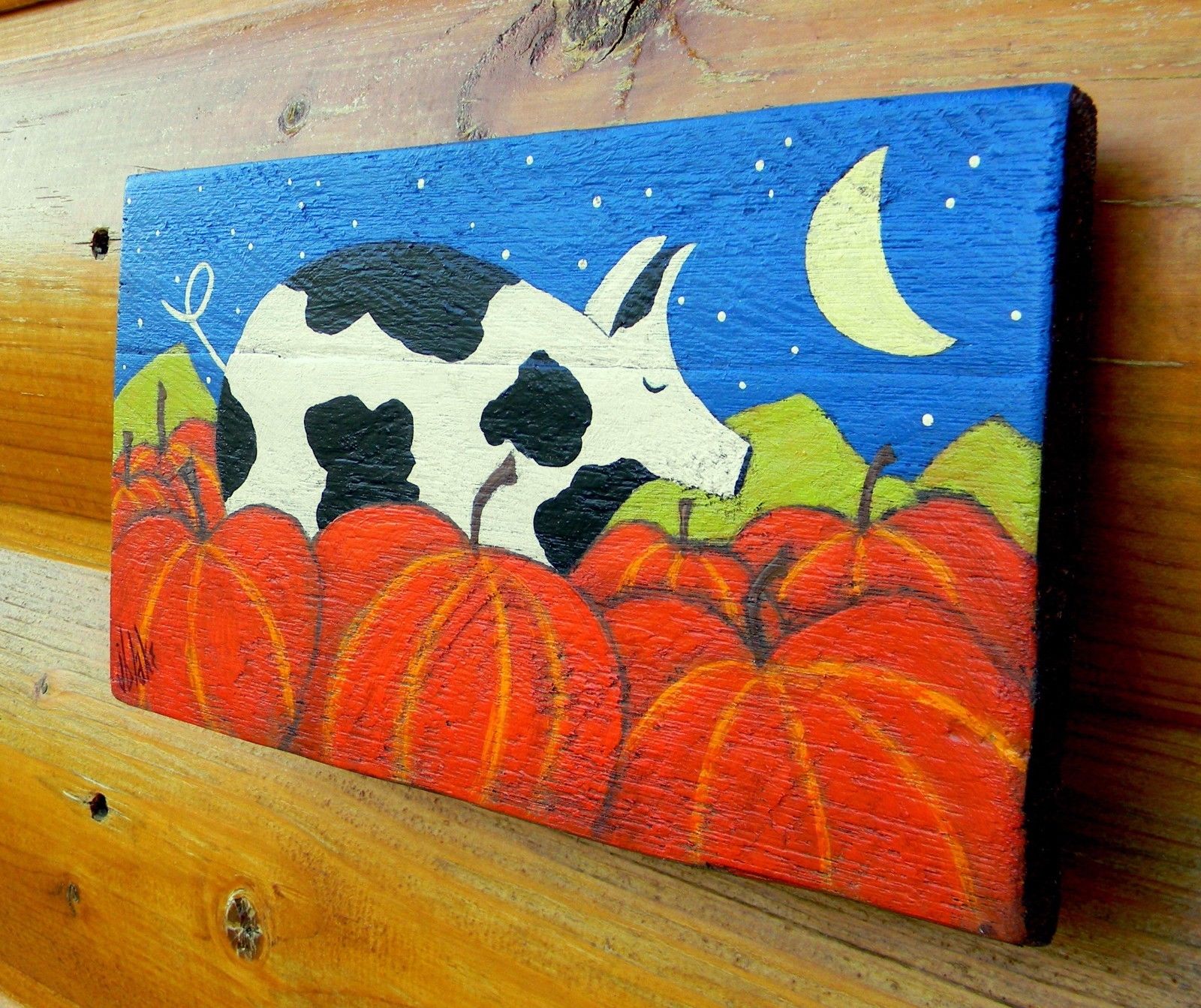 Title (ebay affiliate link): Primitive FOLK ART Pig~Pumpkins~Prim Fall PAiNTiNG on a Rustic Board~John Blake