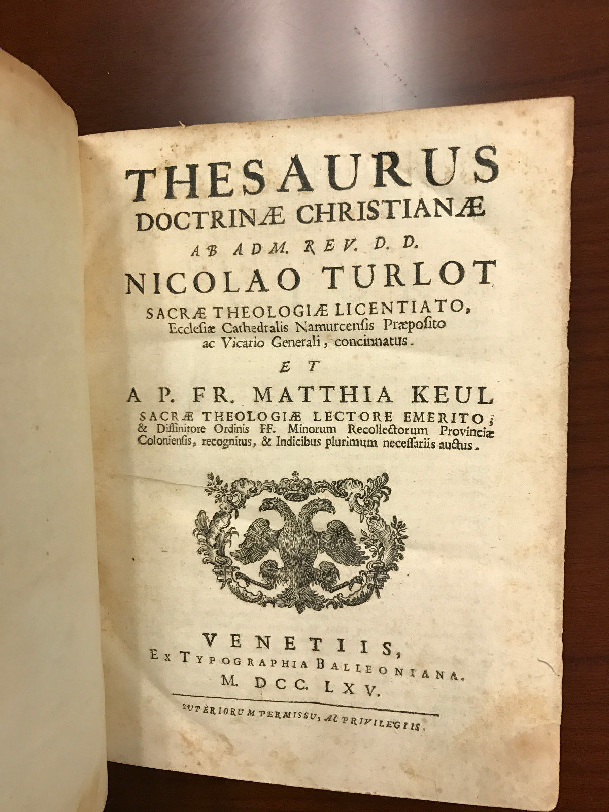Title (ebay affiliate link): Thesarus Doctrinae Christianae. Nicolao Turlot. Venice, 1765.