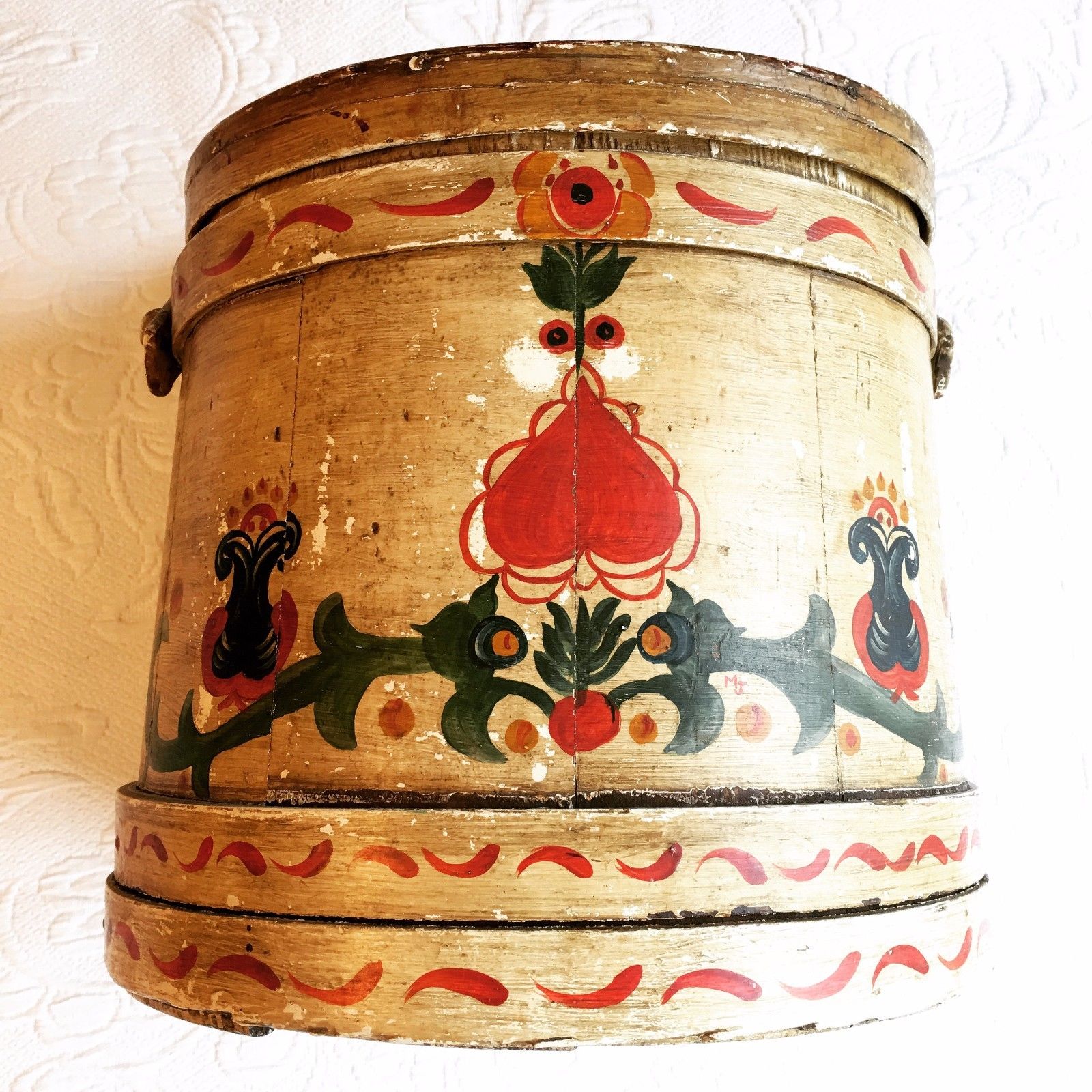 Title (ebay affiliate link): LARGE ANTIQUE PRIMITIVE HAND-PAINTED WOOD FIRKIN SUGAR BUCKET WITH LID & HANDLE