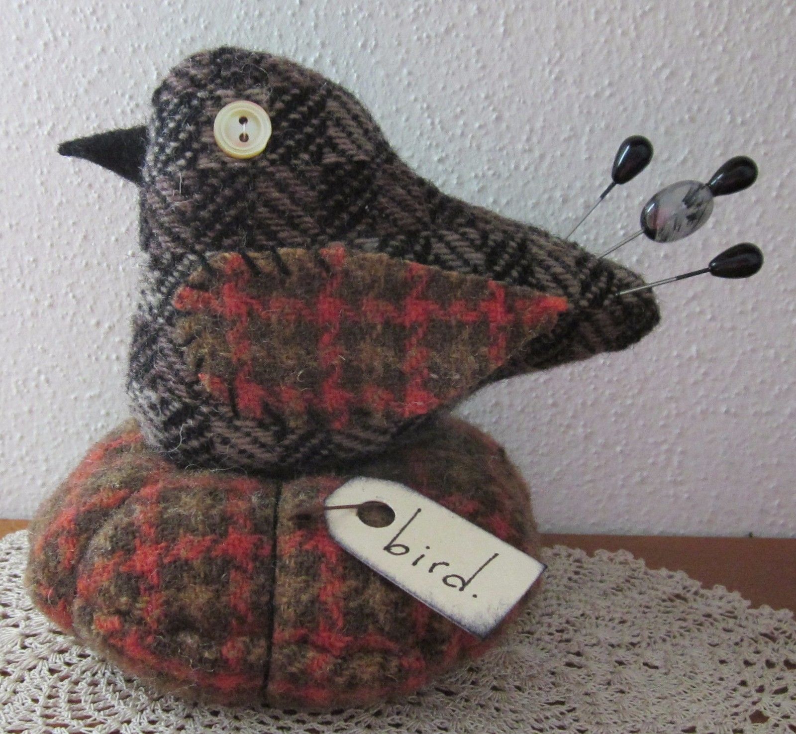 PRIMITIVE WOOL BIRD MAKE DO PIN CUSHION PFATT