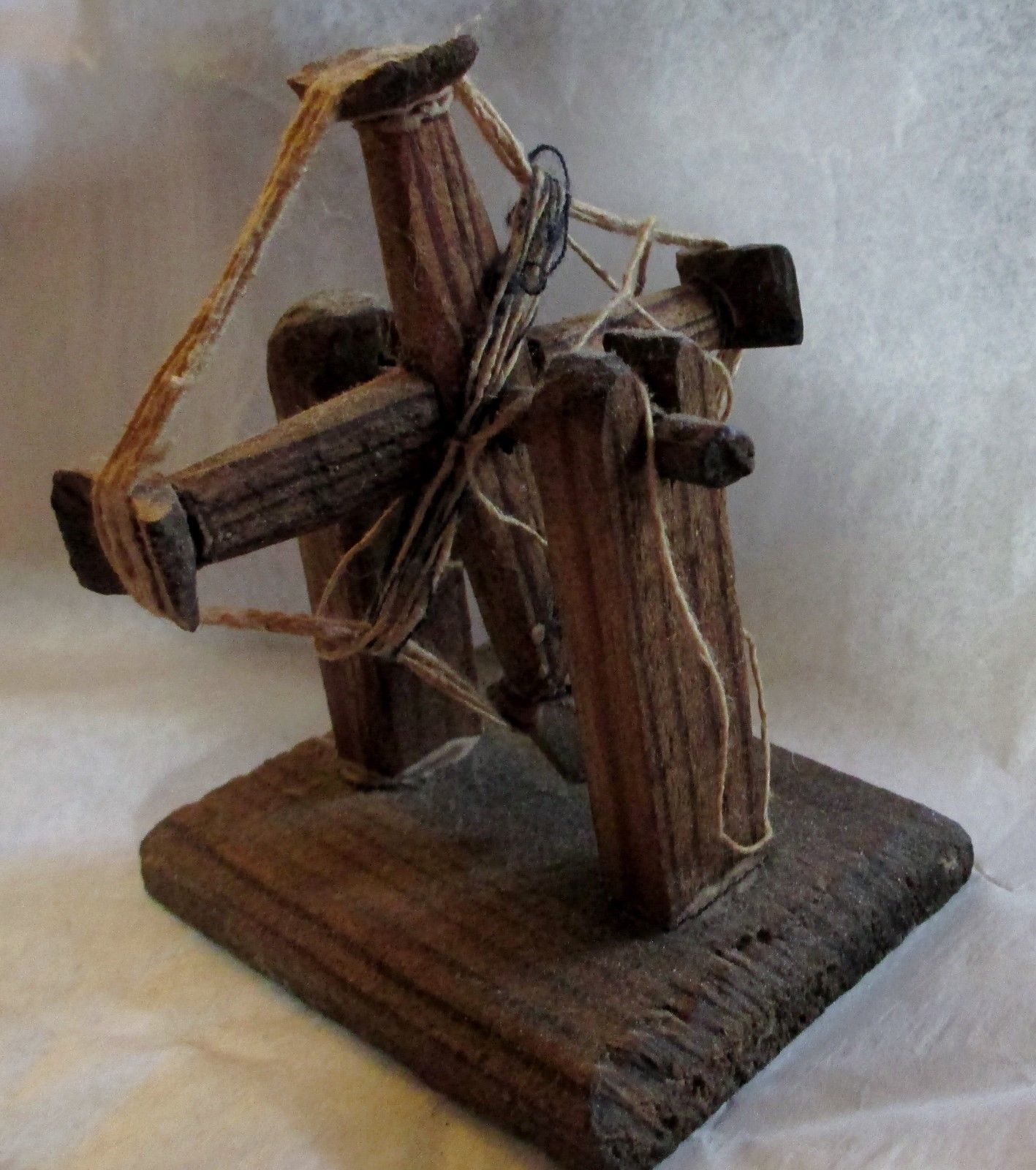 Title (ebay affiliate link): Antique Miniature 4" Tall Primitive Wooden Spinning Wheel