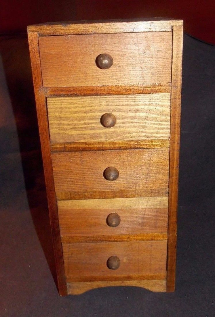 PRIMITIVE WOOD APOTHECARY SPICE 5 DRAWER CABINET!SZ. 10" TALL X 4 1/2" X 3" DEEP