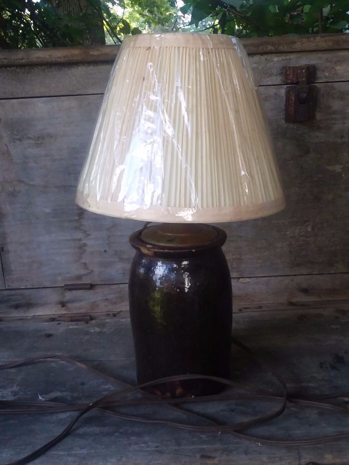 Title (ebay affiliate link): Early Primitive ANTIQUE BROWN SALT GLAZE POTTERY Crock LAMP- NC or PA