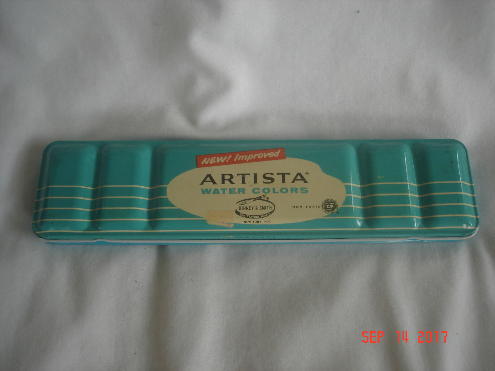 Title (ebay affiliate link): NICE Vtg. SET 7 ARTISTA WATER COLORS No. 07W in TIN LITHO BOX Binney & Smith USA