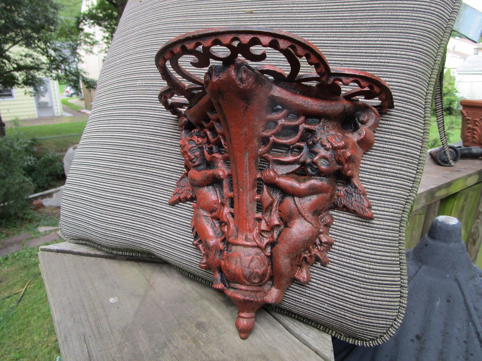 ANTIQUE CAST Iron Wall SCONCE Shelf W CHERUDS Bracket Heavy