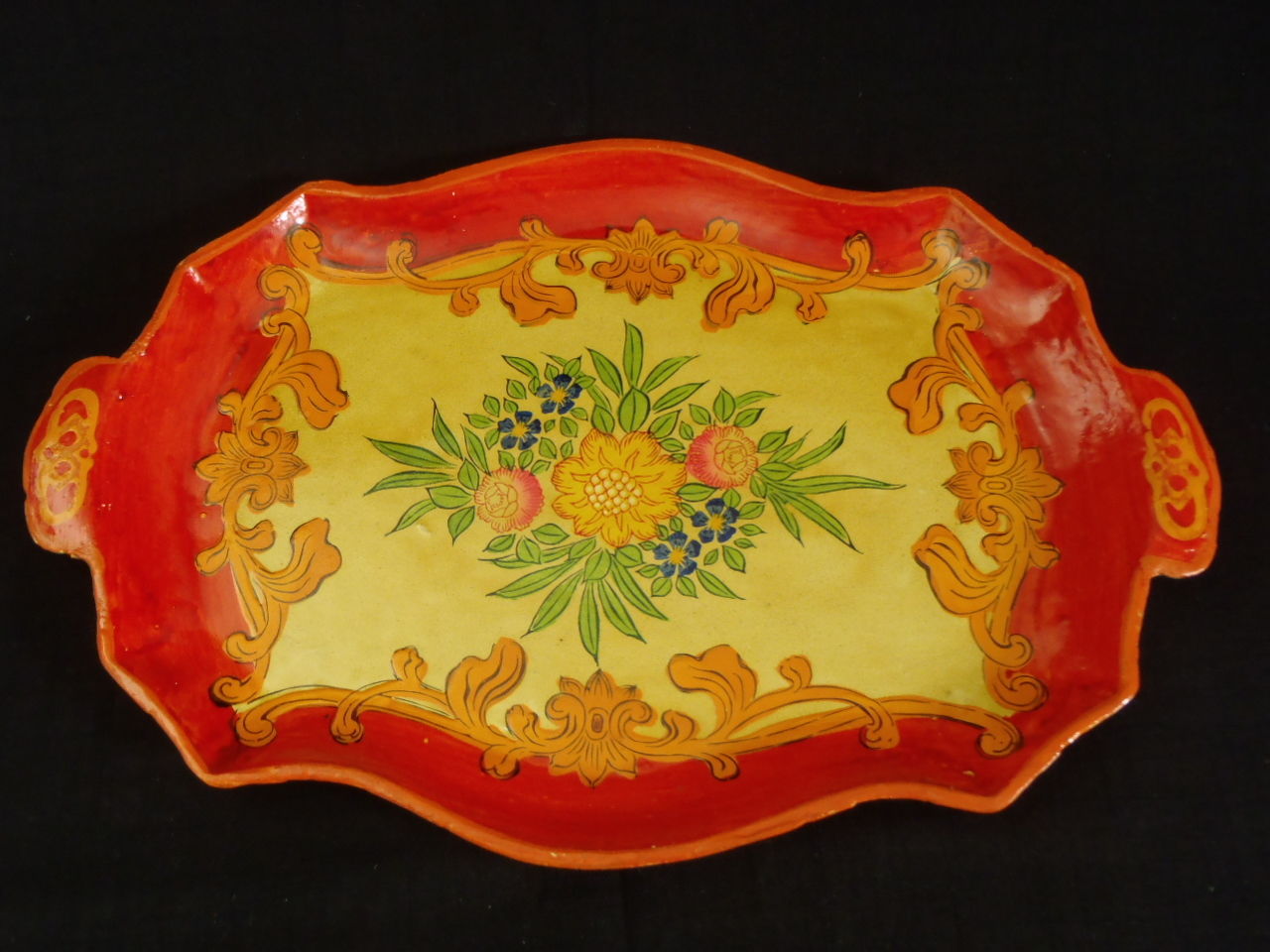 Title (ebay affiliate link): Exquisite Handmade & Hand Painted Floral Paper Mache Vintage Tray, color red