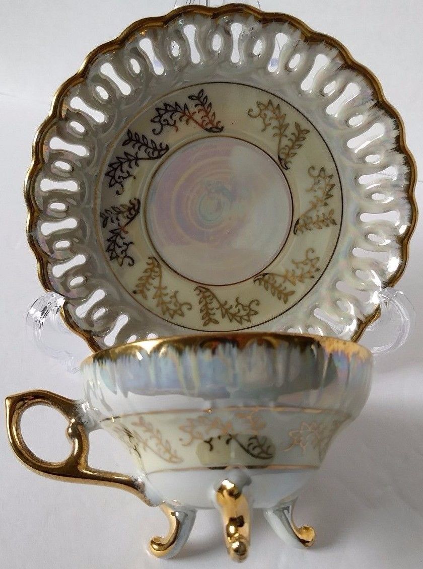 Title (ebay affiliate link): VINTAGE 3 Footed Tea Cup Teacup Saucer Gold Trim Iridescent Irridescent Luster