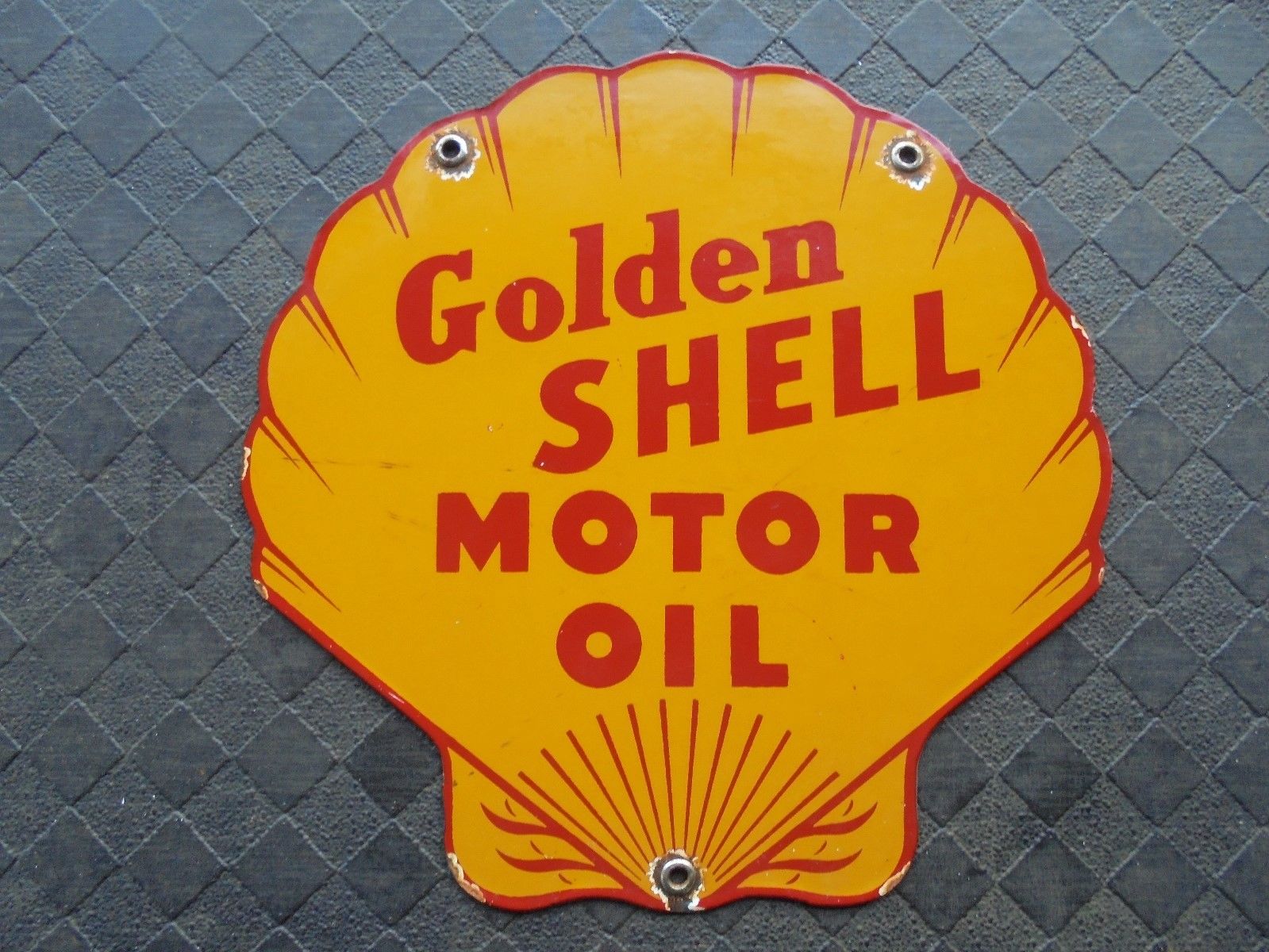 Golden Shell Motor Oil porcelain pump plate sign can seed farm deere car garage