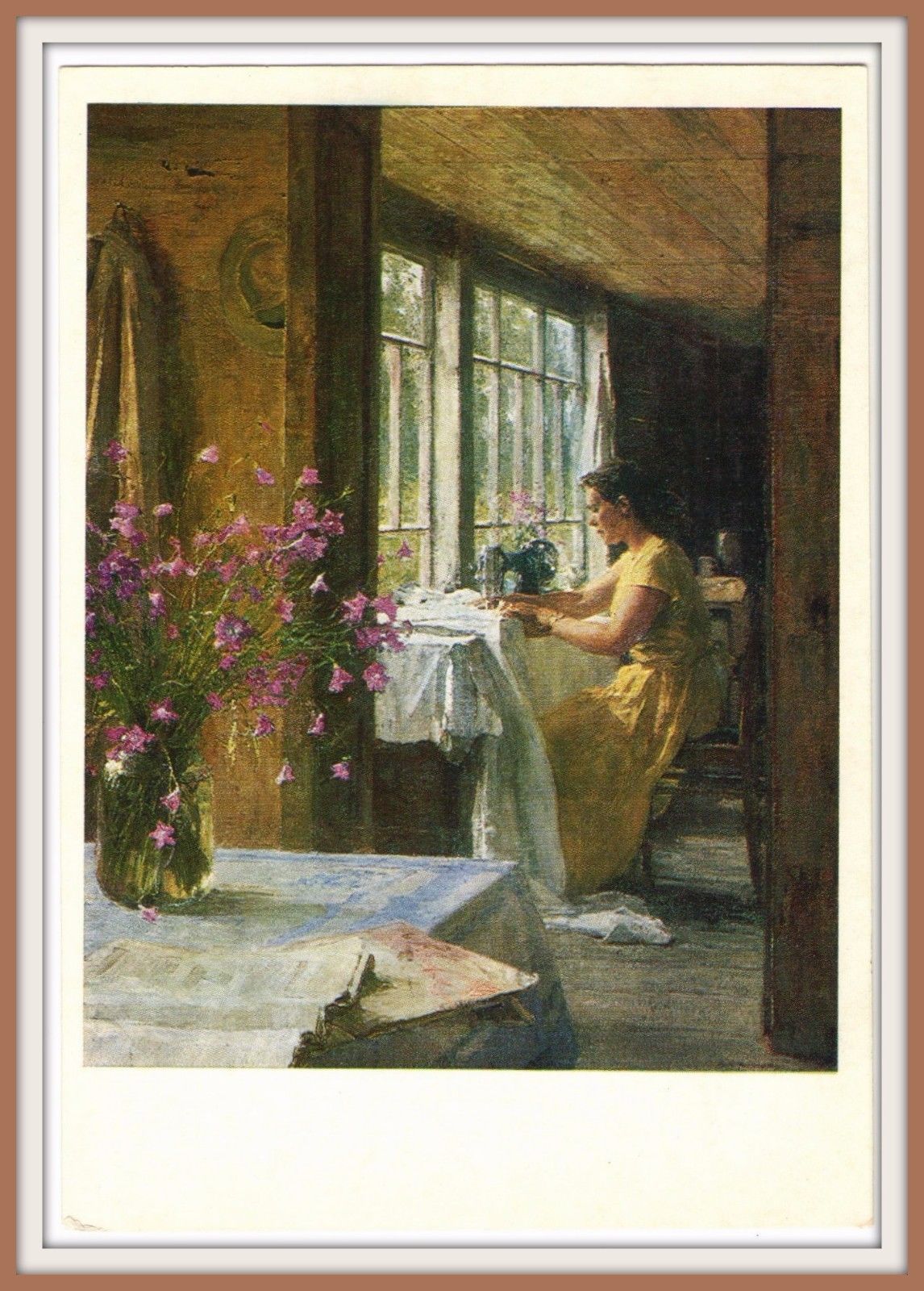 Title (ebay affiliate link): Summer House SEWING MACHINE Girl Woman BLUEBELLS Soviet Art Russian Postcard vtg