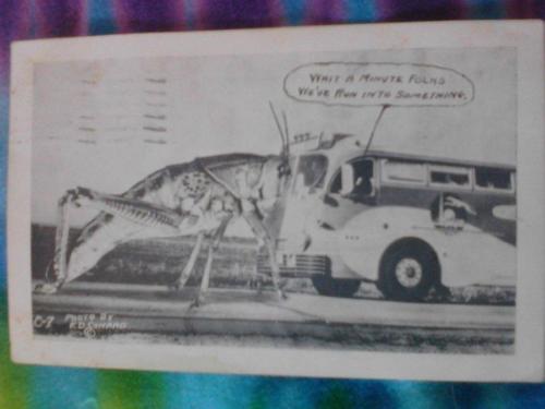 VINTAGE RPPC EXAGGERATED GRASSHOPPER WE RAN INTO SOMETHING. POSTED WITH STAMPS