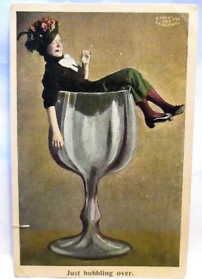 Title (ebay affiliate link): 1908 POSTCARD JUST BUBBLING OVER,WINKING GIRL LAYING ON GIANT WINE GLASS