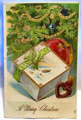 Title (ebay affiliate link): 1909 POSTCARD MERRY CHRISTMAS, GIFT & APPLE BY CHRISTMAS TREE