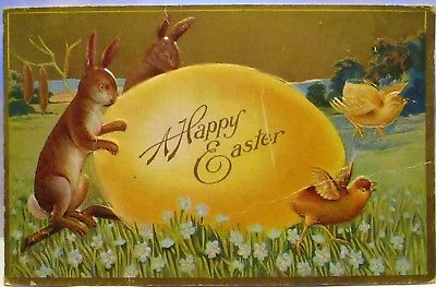 Title (ebay affiliate link): 1910 POSTCARD HAPPY EASTER,BUNNIES & CHICKS WITH LARGE YELLOW EGG