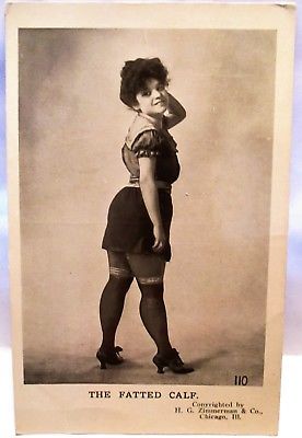 Title (ebay affiliate link): 1910 RISQUE POSTCARD THE FATTED CALF -GIRL IN MINI SKIRT & THIGH HIGH STOCKINGS