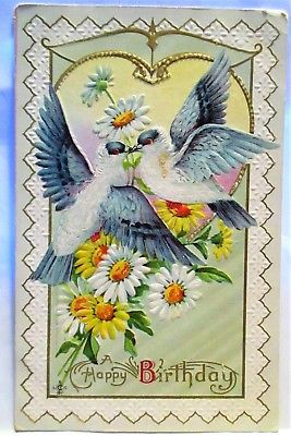 Title (ebay affiliate link): 1913 POSTCARD HAPPY BIRTHDAY,GREY-WING DOVES ON HEART & DAISIES
