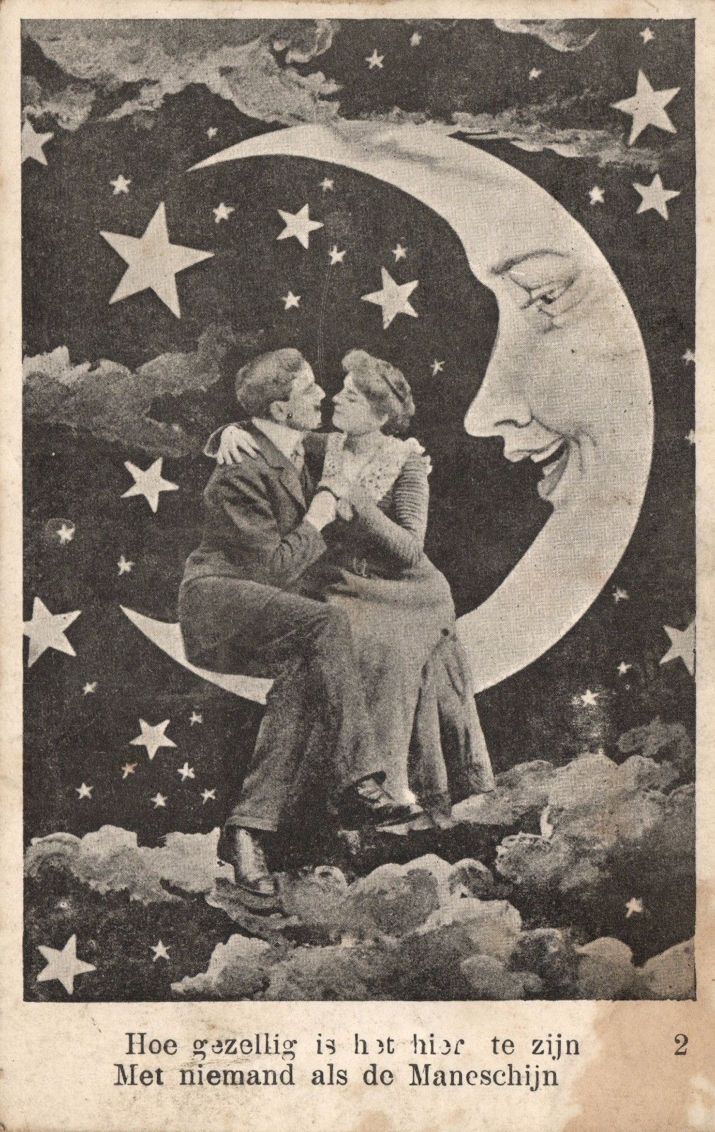 couple sitting on PAPER MOON lovers vintage photo postcard 1903