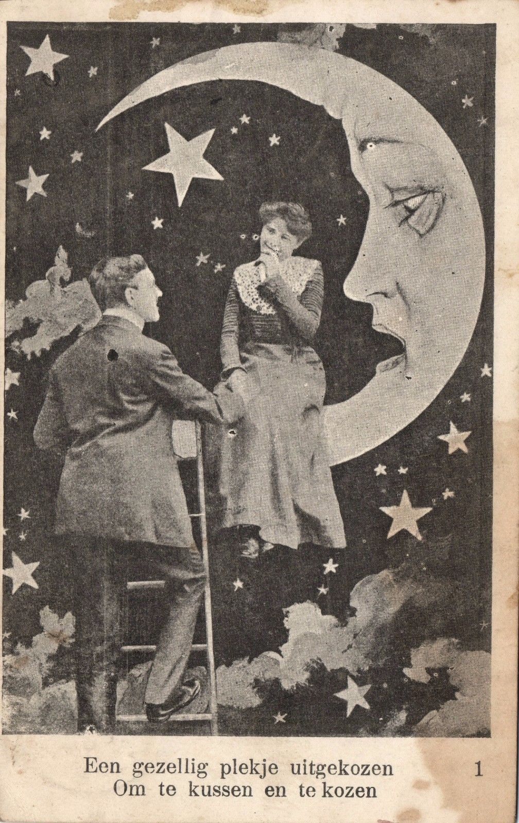 Title (ebay affiliate link): couple in love on PAPER MOON ladder stars vintage photo postcard 1903