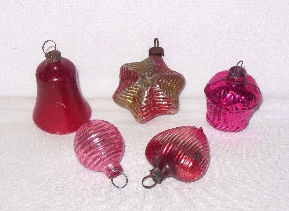 Title (ebay affiliate link): 5 Antique Vtg Mercury Glass Ribbed Christmas Feather Tree Ornaments Heart Star