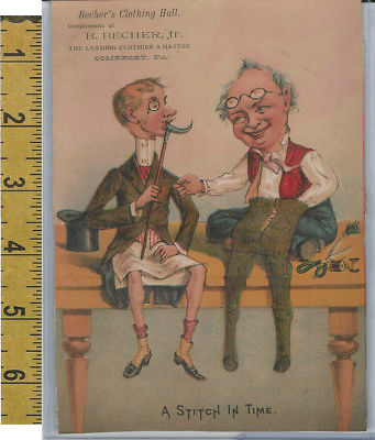 Title (ebay affiliate link): Victorian Card, 1890''s, Becher Clothier, Somerset PA, A Stitch In Time