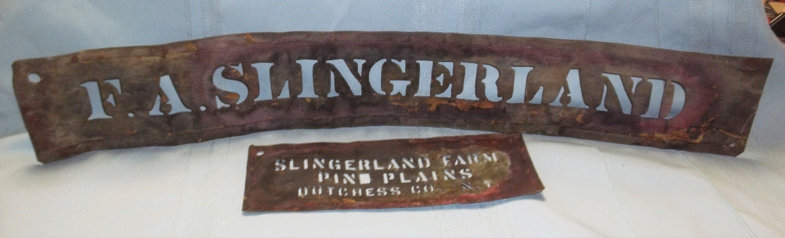 2 OLD BRASS CRATE STENCILS-F. A. SLINGERLAND+SLINGERLAND FARM-PINE PLAINS, N.Y.