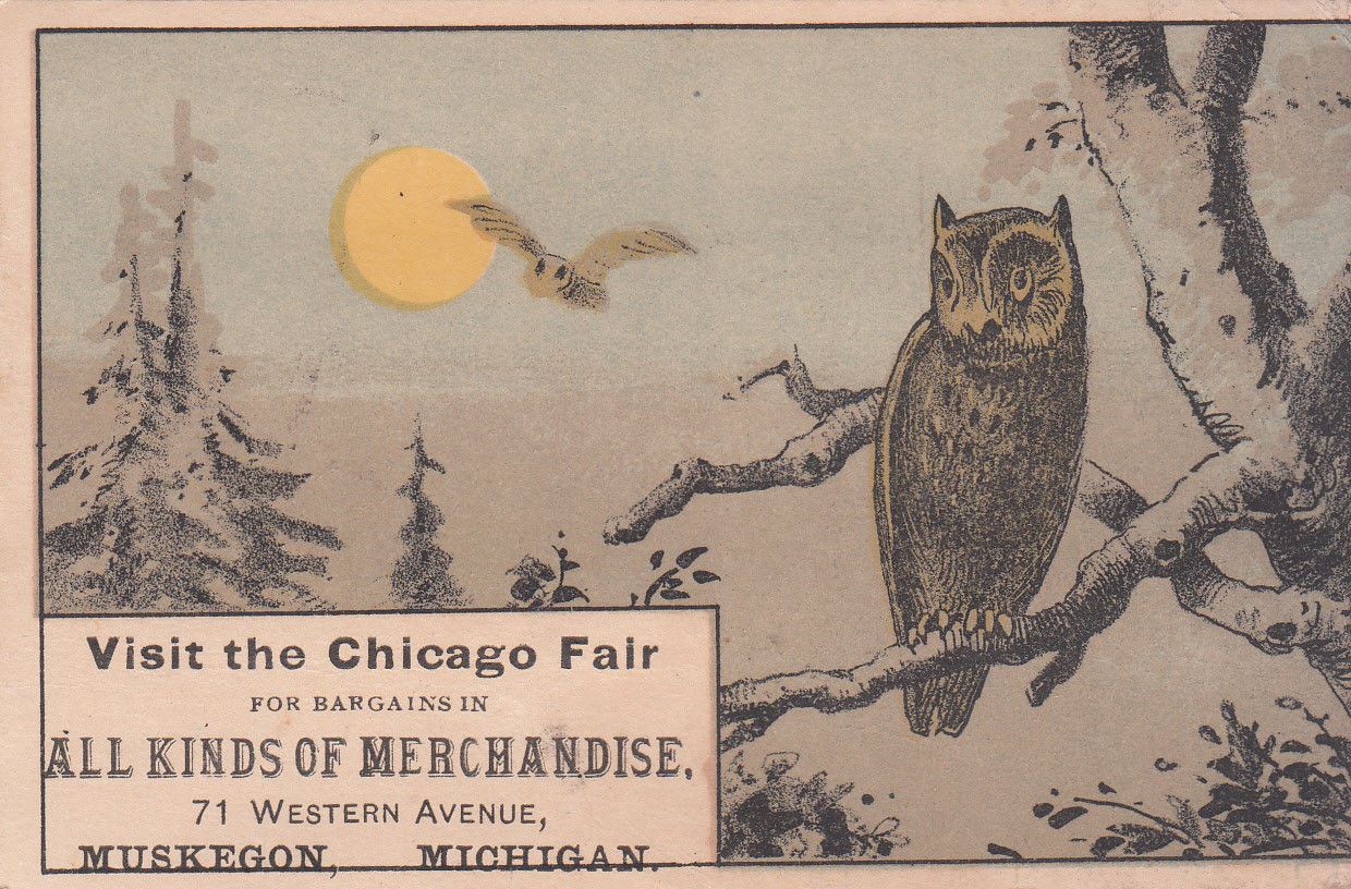 Title (ebay affiliate link): Chicago Fair Merchandise Muskegon Michigan Owl on Branch Moon Vict Card c 1880s
