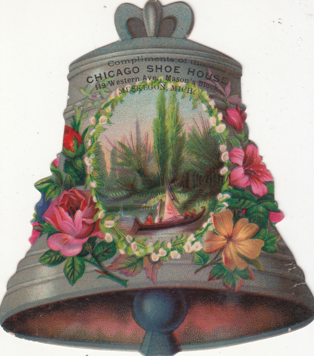 Chicago Shoe House Muskegon MI Bell Diecut Flowers Boat Vict Card c 1880s
