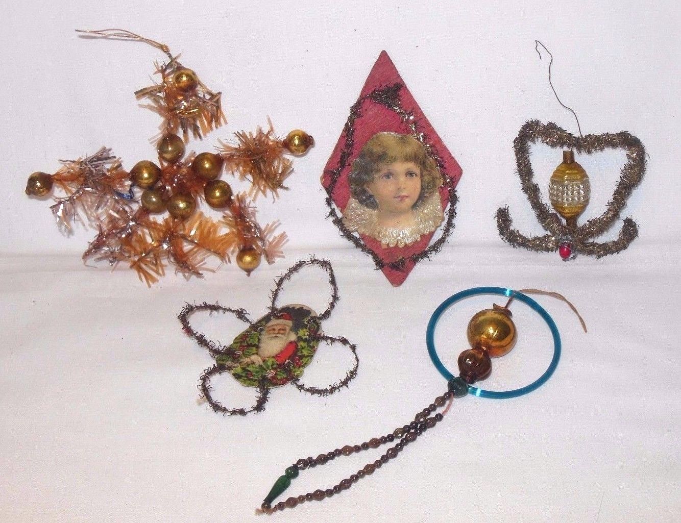 5 Antique Vintage Christmas Ornaments Tinsel Mercury Glass