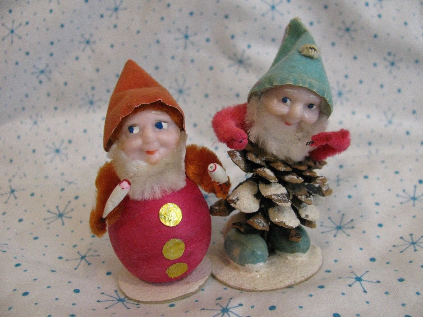 Title (ebay affiliate link): 2 Vintage Christmas Pine Cone Elf Pixie GNOMES Japan Celluloid Faces JAPAN