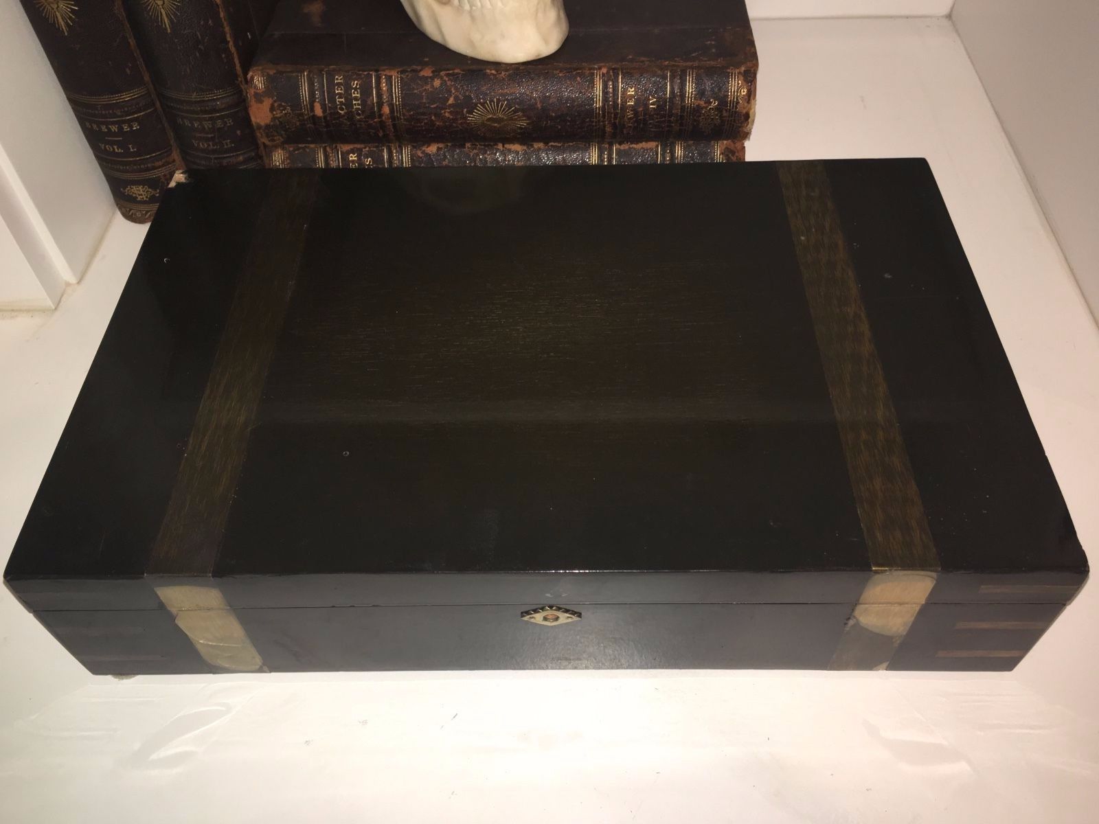 Title (ebay affiliate link): ANTIQUE English Inlaid Banded Lacquered Wood Document Writing Box w/ Key