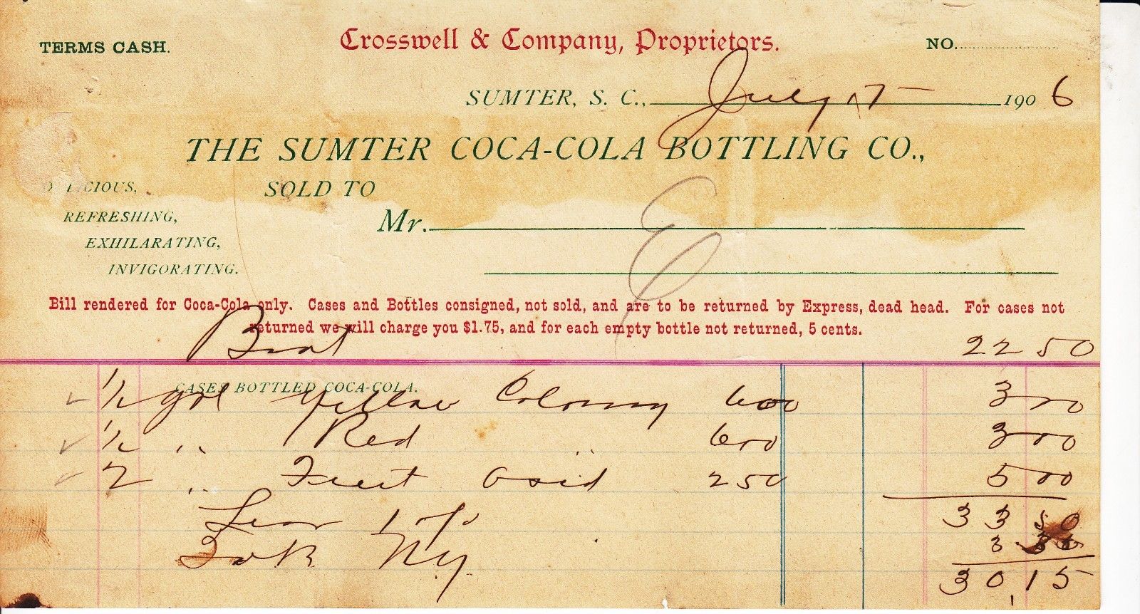 Title (ebay affiliate link): SUMTER COCA-COLA BOTTLING CO. INVOICE DATED JULY 17, 1906 111 YEARS OLD