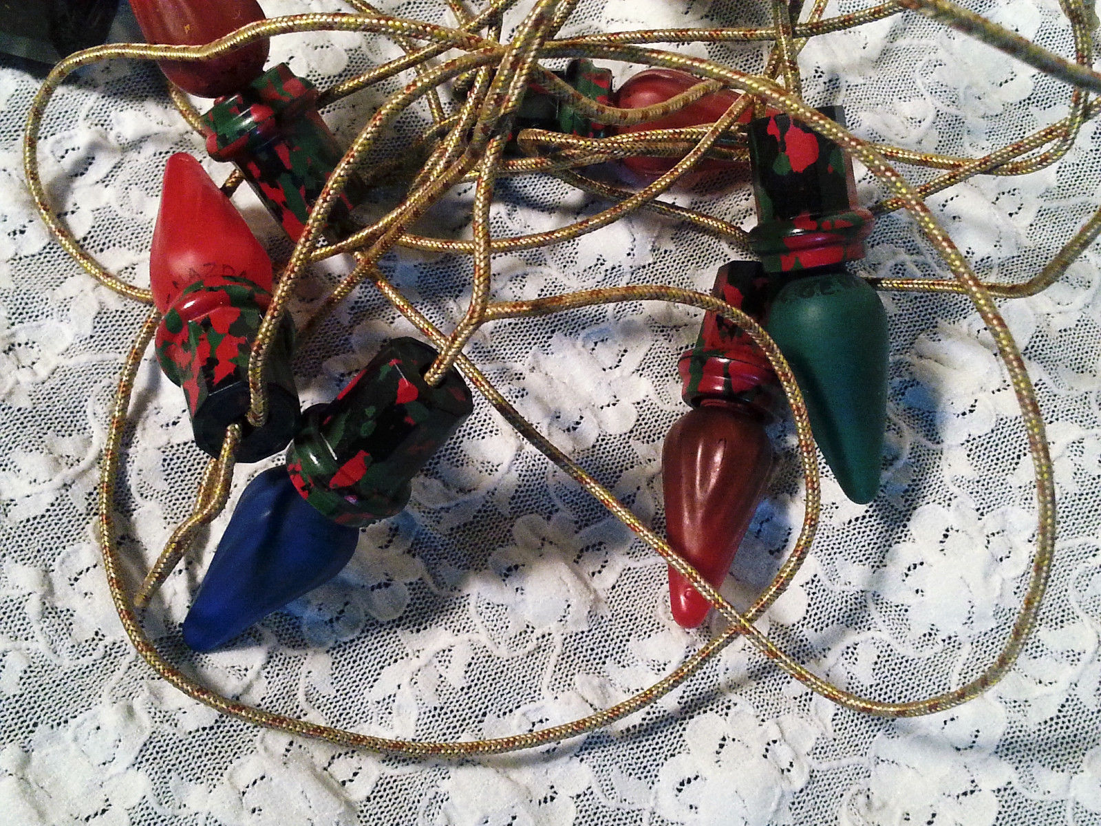 Title (ebay affiliate link): Antique Christmas lights Mazda & Paramount cloth cord-works