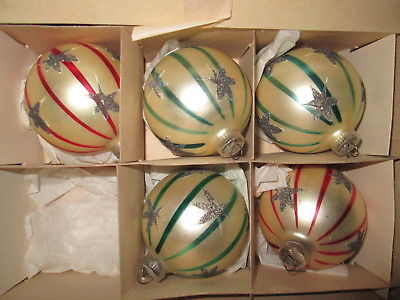 5 Antique Blown Glass Christmas Ornaments Large Painted Striped W Germany In Box