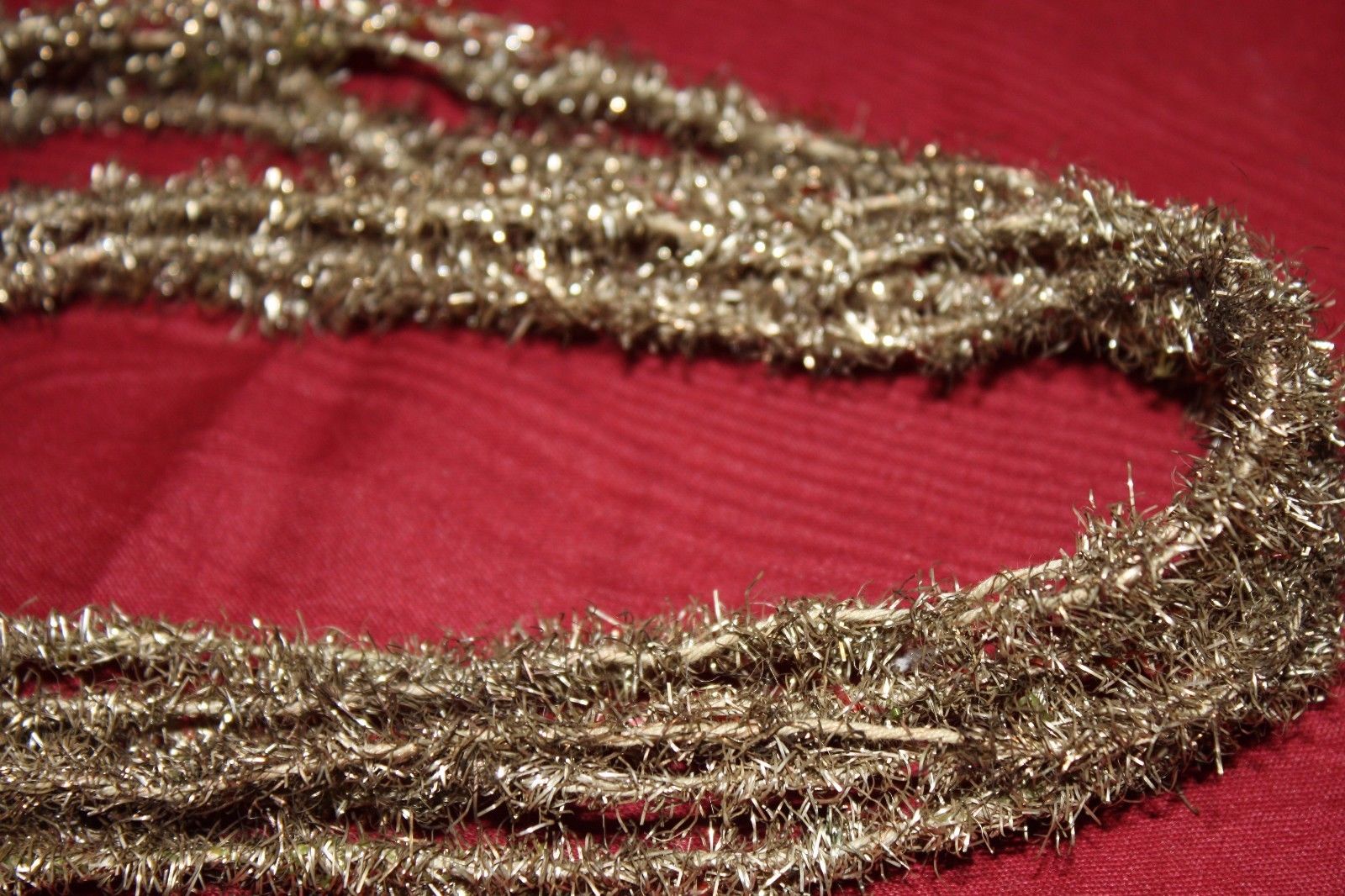 Title (ebay affiliate link): Antique Feather Tree Tinsel Garland Gold & Red & Pale Green 13''4" Long