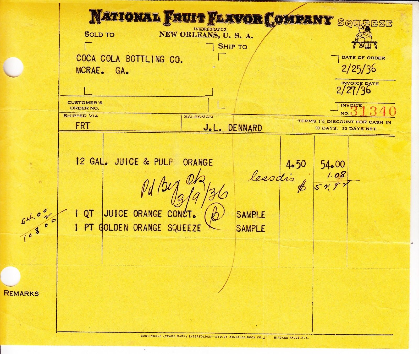 NATIONAL FRUIT FLAVOR COMPANY INVOICE DATED 2/25/36 NEW ORLEANS U. S. A.