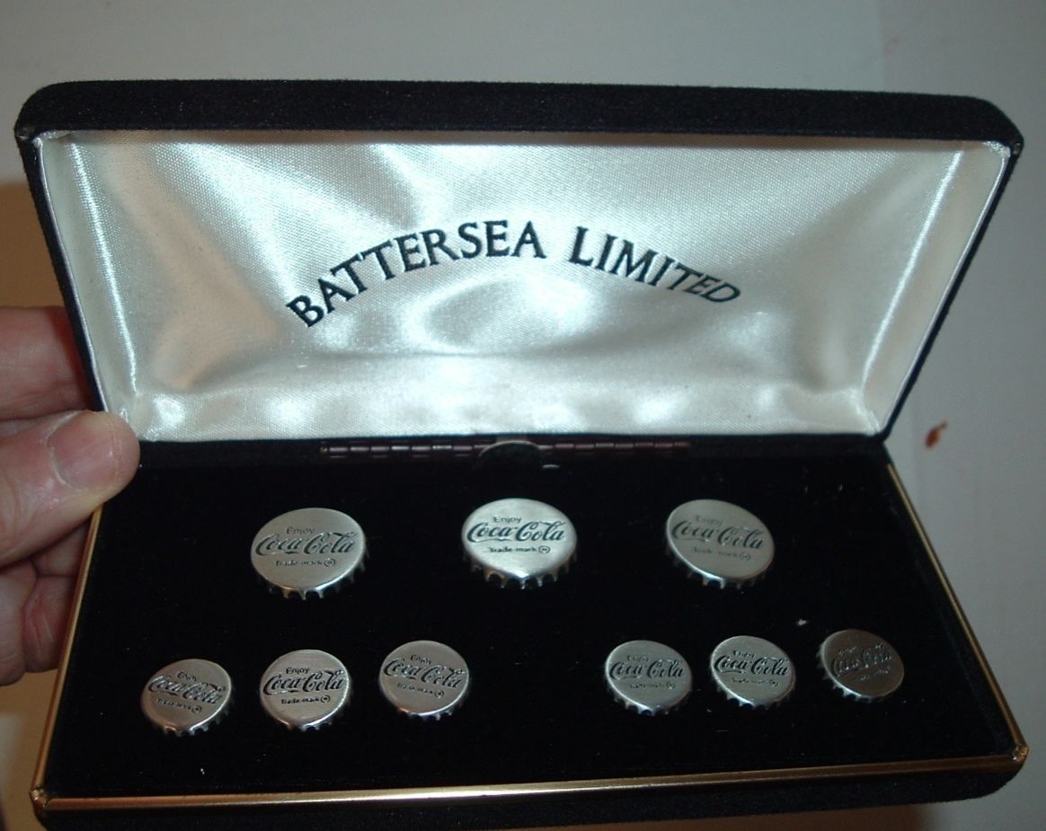 RARE Vintage Coca Cola Soda Pop BATTERSEA BUTTON Coke Bottle Cap Set Min tn Box