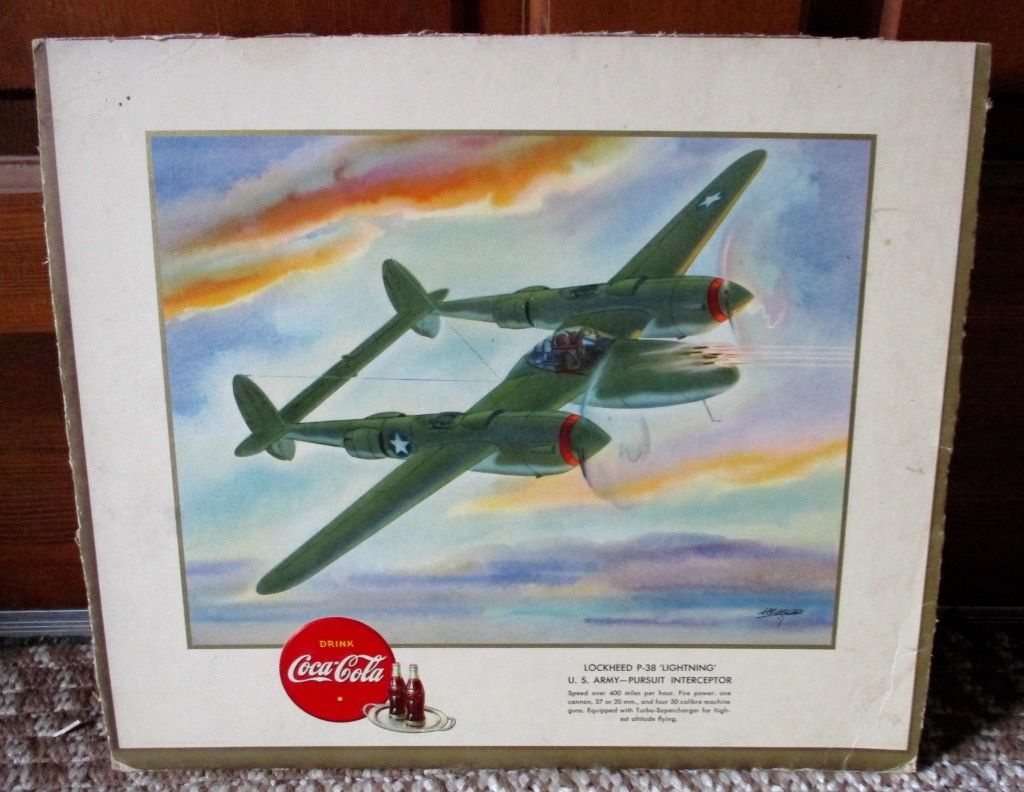 Title (ebay affiliate link): 1943 COCA-COLA "FIGHTING PLANES" Litho Cardboard SIGN.."Lockheed P-38 LIGHTNING"